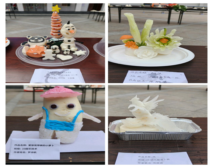 在丰收的喜悦中,同学们并未止步。他们结合自己的专业特色,赋予萝卜全新的生命力。从栩栩如生的动物造型到精致细腻的图案雕塑,每一件作品都凝聚着同学们的巧思与汗水。经过激烈的创意比拼与师生共同组成的评审团的公正评选,最终决出了一二三等奖共12名,这些作品不仅创意满满、意趣横生,更是2023年段师生劳动教育成果的生动体现。